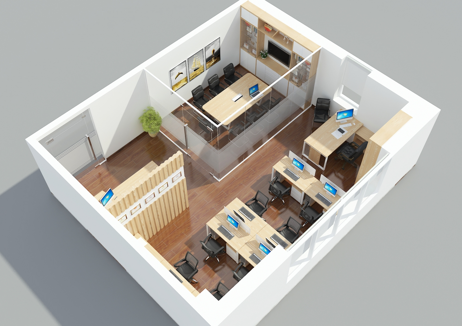 Quy mô: 15 vị trí làm việc + phòng họp + quầy lễ tân